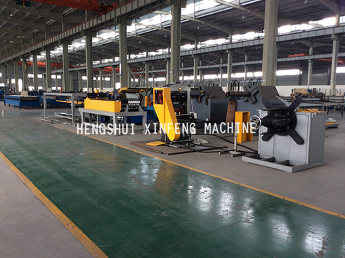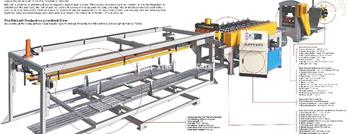 Layout: feeding trolley - uncoiler - expanded main machine - roll profiling machine - hydraulic rib lath shearing machine - hydraulic automatic rib lath collect - control cabinet